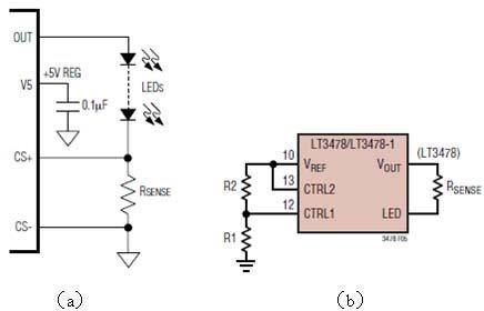調節LED的電流最簡單的方法就是改變和LED負載串聯的電流檢測電阻(圖2a),幾乎所有DC-DC恒heng流liu芯xin片pian都dou有you一yi個ge檢jian測ce電dian流liu的de接jie口kou,是shi檢jian測ce到dao的de電dian壓ya和he芯xin片pian內nei部bu的de參can考kao電dian壓ya比bi較jiao,來lai控kong製zhi電dian流liu的de恒heng定ding。但dan是shi這zhe個ge檢jian測ce電dian阻zu的de值zhi通tong常chang很hen小xiao,隻zhi有you零ling點dian幾ji歐ou,如ru果guo要yao在zai牆qiang上shang裝zhuang一yi個ge零ling點dian幾ji歐ou的de電dian位wei器qi來lai調tiao節jie電dian流liu是shi不bu大da可ke能neng的de,因yin為wei引yin線xian電dian阻zu也ye會hui有you零ling點dian幾ji歐ou了le。所suo以yi有you些xie芯xin片pian提ti供gong一yi個ge控kong製zhi電dian壓ya接jie口kou,改gai變bian輸shu入ru的de控kong製zhi電dian壓ya就jiu可ke以yi改gai變bian其qi輸shu出chu恒heng流liu值zhi。例li如ru淩ling特te公gong司si的deLT3478(圖2b)隻要改變R1和R2的比值,也可以改變其輸出的恒流值。