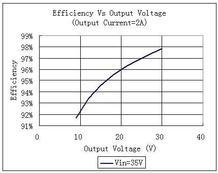 圖中的輸入電壓為35V,輸出電流為2A,當輸出電壓為30V時,效率可以高達97.8%。但是當輸出電壓降低到20V時,效率就降為96%;當輸出電壓降低為10V時,效率就降低為92%。在這三種情況下,盡管其輸出功率依次為60W,40W和20W,但是其損耗功率卻依次為1.2W,1.6W,1.6W。後兩種情況下功耗增大了33%。假如恒流模塊的散熱係統設計得非常臨界,增加33%的耗散功率就有可能會使芯片的結溫升高,以致發生過溫保護而無法工作,嚴重時也有可能使芯片燒毀。