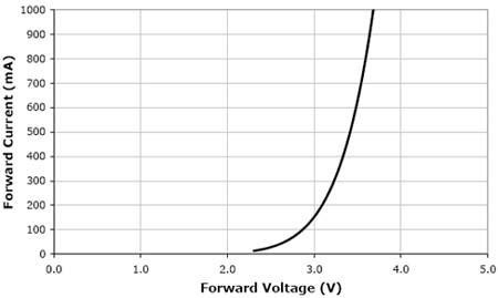 由圖中可知,假如以350mA時的光輸出作為100%,那麼200mA時的光輸出就大約是60%,100mA時大約是25%。所以調電流可以很容易實現亮度的調節。
