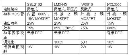目前市場上主要有恩智浦的SSL2101/2,國半的LM3445,iWatt的iW3610和OnSemi的NCL3000四種兼容可控矽調光的驅動IC。其特點如下: