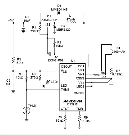 圖7所示電路是用於單節NiMH電池充電的開關模式降壓型調節器。它采用DS2712充電控製器調節充電電流和終止充電。充電控製器監視溫度、電池電壓和電池電流。如果溫度超過+45°C或者低於0°C,控製器不會對電池充電。
