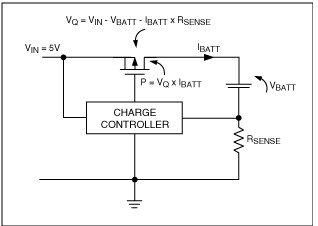 USB 2.0規範允許低功率端口提供最大100mA電流,大功率端口提供最大500mA電流。如果采用線性調整器件來調節電池充電電流,這也就是最大可提供的充電電流。線性調整器件(圖4)的功耗為P = VQ x IBATT。這會造成調整管發熱,可能需要安裝散熱器,以防止過熱。