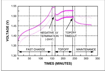 終止檢測在充電速率大於C/3時要比低充電速率時容易得多。溫度上升速率大約為1°C/分鍾,-ΔV響應也比低充電速率時更明顯。快充結束後,建議以更小的電流再充一段時間,以徹底充足電池(補足充電)。補足充電階段結束後,采用C/20或者C/30的涓充電流來補償自放電效應,使電池維持在充滿狀態。圖3所示為采用DS2712 NiMH充電器對NiMH電池(事先已充了一部分電)進(jin)行(xing)充(chong)電(dian)的(de)電(dian)池(chi)電(dian)壓(ya)曲(qu)線(xian)。在(zai)該(gai)圖(tu)中(zhong),上(shang)麵(mian)一(yi)條(tiao)曲(qu)線(xian)的(de)數(shu)據(ju)在(zai)充(chong)電(dian)電(dian)流(liu)正(zheng)在(zai)灌(guan)入(ru)電(dian)池(chi)時(shi)獲(huo)得(de),下(xia)麵(mian)那(na)條(tiao)曲(qu)線(xian)的(de)數(shu)據(ju)在(zai)切(qie)斷(duan)電(dian)流(liu)時(shi)測(ce)得(de)。在(zai)DS2712中,該電壓差被用來區分NiMH電池和堿性電池。如果檢測到堿性電池,則DS2712不會對它進行充電。