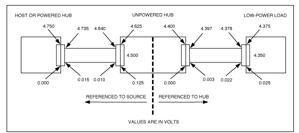 當USB端口帶有一個總線供電的USB集線器,集線器上接了低功耗設備時,USB口上允許的直流電壓跌落如圖1所示。大功率負載與總線供電的集線器連接時,電壓跌落將超過圖1給出的指標,並會引起總線過載。
