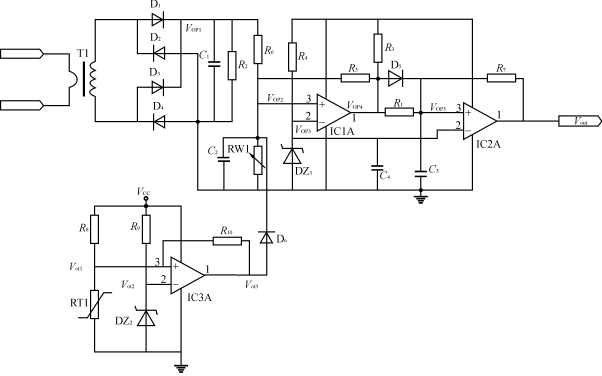 借助上述電路我們可以很容易地構成,輸入過、欠壓保護,輸出過、欠壓保護,以及過熱保護。在此僅以附加過熱保護為例,說明如下:如圖1所示,過熱保護線路是由IC3A及其周邊元件組成。當電源的溫度沒有超過設定溫度時,Vot1<Vot2,運放IC3A的輸出電壓Vot3為低電平,由於有二極管D6的存在,此時IC3A的輸出電壓Vot3不會影響到VOP2的電壓,也就是說在過熱保護線路未起作用時,它不會影響到上述的過流保護線路的性能。當電源的溫度超溫時Vot1>Vot2,運放IC3A的輸出電壓Vot3變為高電平,通過二極管D6,使VOP2的de電dian壓ya升sheng高gao,從cong而er觸chu發fa過guo流liu保bao護hu線xian路lu使shi電dian源yuan進jin入ru停ting止zhi工gong作zuo期qi。隻zhi有you當dang電dian源yuan溫wen度du降jiang低di到dao超chao溫wen保bao護hu點dian以yi下xia時shi,電dian源yuan才cai能neng重zhong新xin進jin入ru正zheng常chang工gong作zuo狀zhuang態tai。依yi此ci類lei推tui可ke以yi構gou成cheng其qi它ta輸shu入ru輸shu出chu過guo、欠壓保護線路。在此不再贅述。