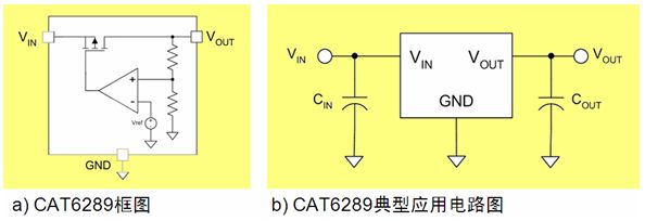 圖4:CAT6289超低工作電流NanoPower LDO框圖及典型應用電路圖。