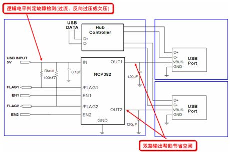 NCP382則是一款功率分配開關,其設計針對很可能會遇到大的電容性負載或短路的應用。實際上,越來越多便攜電子設備采用USB供電,但需要保護本地USB電源夠用受外部Vbus故障影響。NCP382能夠通過在輸出負載超過限流閾值或出現短路時切換至恒流模式,將輸出電流限製在期望的電平(0.5 A、1 A或1.5 A),從而提供過流保護。NCP381接收2.5 V至5.5 V的單路輸入,提供2路輸出。圖6是NCP382的典型應用電路圖。