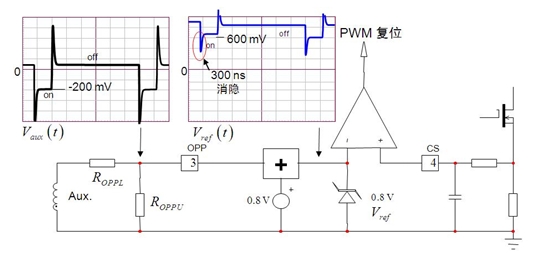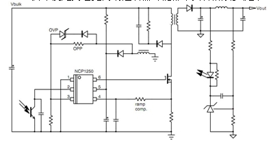 如圖 1 所示,電路中的光耦合器斷路或 TL431 分壓器網絡遭受嚴重漂移影響(或其某個電阻丟失或出現錯誤值)時,輸出電壓就可能超出規定的限製值,這就是過壓條件。大多數情況下,過壓條件可能對下行負載有害,適配器這時必須完全關斷。NCP1250/1 在 OPP 引腳上也集成了 3 V 參考比較器,這比較器可用於多種功能,如 OVP。如果這 OPP 引腳電壓連續四次超過 3 V,就使控製器 IC 閂鎖保護。