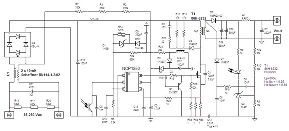 圖 4(a):基於 NCP1250 的 19 V/65 W 適配器電路圖