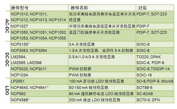 關穩壓器 NCP3155、1.5 A 開關穩壓器 NCP3063/4、0.5/1.0/3 A 開關穩壓器 LM2594/5/6、NCP3020/11 脈寬調製(PWM)控製器及 NCP1034 PWM 控製器。