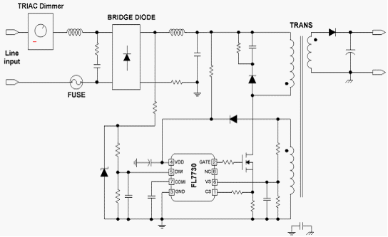 為幫助設計人員解決這些問題,飛兆半導體公司開發出帶有功率因數校正(PFC)、TRIAC和模擬調光能力的FL7730單級初級端調節(PSR)控製器。該款驅動器采用獨特的模擬感測技術,可在從0至100%光輸出的整個範圍內實現無閃爍的TRIAC調光控製。FL7730調光電壓形成內部CS補償以降低調整輸出電流,調光能兼容市場80%以上調光器產品。