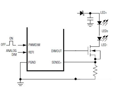 然後用一個PWM信號加到MOS管的柵極,以快速地開關這串LED。從而實現調光。也有不少恒流芯片本身就帶一個PWM的接口,可以直接接受PWM信號,再輸出控製MOS開關管。