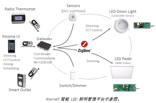 Marvell智能 LED照明管理平台提供了完全集成的LED照明和無線控製係統,因此不論是易用性的提升還是安裝成本的降低都趨向於極致,大大簡化了使用和維護難度,使得 非專業人員也能輕鬆應對。該平台的一大特色是允許終端用戶可以使用智能手機和平板電腦方案,使他們可以方便地從任何地方管理、分析並維護一個更具性價比的數字照明方案。這種智能LED照明平台可以顯著地節約商業和住宅用電。並且隨著新的LED照明應用的推出,用戶還可以添加更多安全功能以及增強遠程管理的體驗,如高質量的照明調整、氣氛和現場的控製等。