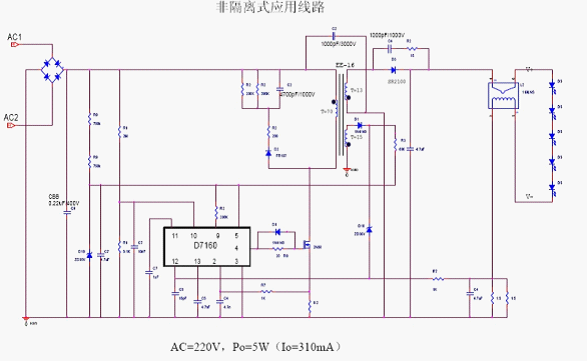 針對於無電解電容方案的LED驅動器的開發,上海得倍電子也推出了一款D7160 是無電解電容的LED驅動IC。它無需電解電容,節省體積,可使印刷電路板麵積縮小至原來的40%,提高整個LED燈具壽命,壽命可達10萬小時以上,綠色環保,白光LED能耗是普通節能燈的1/4,內置抖頻減小EMI,內置各種保護(過溫、欠壓閉鎖、過壓、過流),兼顧功率因數和輸出紋波,內部具有一個30K--130K的壓控振蕩器,使得線路更加穩定,效率更高並可以廣泛應用於照明LED、射燈和日光燈之中。