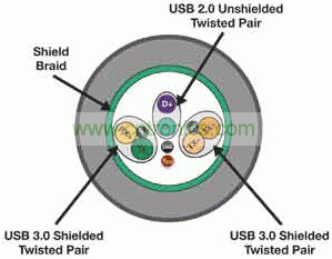 圖2 超高速USB電纜橫截麵顯示了與2.0的差別