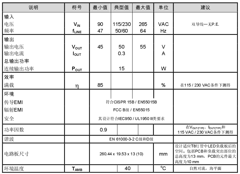 導言: LED T8燈管與同一光度的傳統電燈泡(白熾燈)相(xiang)比(bi)發(fa)光(guang)效(xiao)率(lv)更(geng)高(gao),因(yin)為(wei)所(suo)消(xiao)耗(hao)的(de)能(neng)量(liang)中(zhong)較(jiao)高(gao)比(bi)例(li)被(bei)轉(zhuan)化(hua)為(wei)可(ke)見(jian)光(guang),較(jiao)少(shao)被(bei)轉(zhuan)化(hua)為(wei)熱(re)能(neng)而(er)浪(lang)費(fei)掉(diao),所(suo)以(yi)使(shi)用(yong)中(zhong)的(de)同(tong)一(yi)光(guang)度(du)的(de)日(ri)光(guang)管(guan)比(bi)白(bai)熾(chi)燈(deng)溫(wen)度(du)要(yao)低(di)。本(ben)文(wen)檔(dang)介(jie)紹(shao)的(de)是(shi)一(yi)款(kuan)功(gong)率(lv)因(yin)數(shu)校(xiao)正(zheng)LED驅動器,它可以在90 VAC至265 VAC的輸入電壓範圍內為LED燈串提供額定電壓50 V、額定電流0.3 A的驅動。