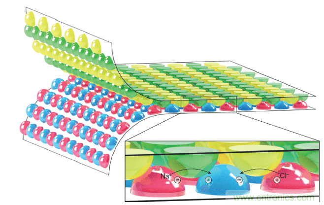 這一設計的機智之處在於:lvseningjiaokuaizhiyunxuzhenglizitongguo,erhuangseningjiaokuaizhiyunxufulizitongguo。zheyiweizhezhenglizizhinengcongyiceliurulanseningjiao,fulizizezhinengconglingyiceliuru。zhejiuzailanseningjiaoshangchanshengleyigedianya,jiuxiangfangdiantiyiyang。erqie,zhengrufangdianti“合作”放電一樣,每個凝膠塊隻能產生微小的電壓,但數千個凝膠塊排成一排時,就能產生高達110伏的電壓。