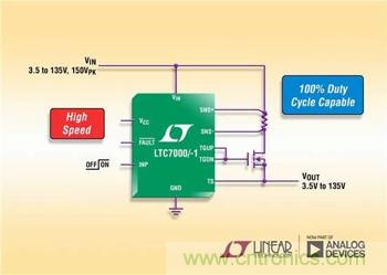LTC7000是一款快速、高壓側 N 溝道 MOSFET 柵極驅動器,主要接收一個參考於地的低電壓數字輸入信號,並以 35ns 的傳播延遲完全接通或關斷一個其漏極可高出地電位達 135V 的高壓側 N 溝道 MOSFET。13ns的快速上升和下降時間 (當驅動一個 1000pF 負載) 最大限度降低了開關損耗。其內部充電泵全麵強化一個外部 N 溝道 MOSFET 開關,因而使之能無限期地保持導通。