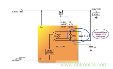 位於 BOOST 和 TS 引腳之間的浮動電源在內部調節至 12V,從而降低了由外部 MOSFET 之導通電阻引起的功率損耗。而強大的輸出器件把外部 MOSFET 保持在由低電壓 INP 信號控製的狀態中,即使在高電壓和高頻瞬變從功率 MOSFET 反饋耦合至驅動電路的情況下也不例外。