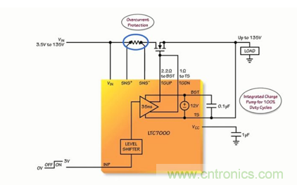 LTC7000 在 INP 引腳上接收一個參考於地的低電壓數字信號、把該信號電平移位至高達 VIN 電壓。並控製片內低阻抗上拉和下拉器件,能快速接通或判斷一個其漏極可高出地電位達 135V 的高壓側 N 溝道 MOSFET。從低電壓 INP 信號至得到全麵強化或被完全關斷的 N 溝道 MOSFET 之傳播延遲約為 35ns,這也促成了許多應用。