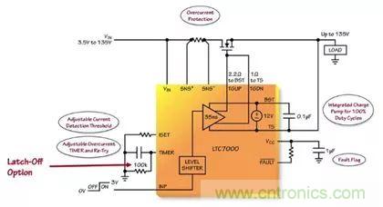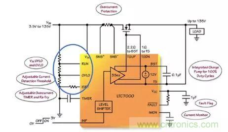 LTC7000 能夠避免負載遭受 VIN 引腳上的過壓和欠壓情況的損壞。“一個連接在 VIN 和地之間、且抽頭連接至 RUN 和 OVLO 引腳的簡單電阻分壓器將設定一個針對負載的有效操作窗口。當 VIN 位於由 RUN 和 OVLO 引腳所設定的操作窗口之外時,則關斷外部 MOSFET,並保護負載免遭潛在損壞或發生故障。” Mark Mullen這樣談到。