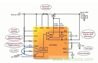 在經過該冷卻周期之後,內部電路將自動嚐試重新接通外部 MOSFET,該重試占空比約為 0.06%。所以應該選擇合適的過流跳變點和 TIMER 電容器,以通過把 MOSFET 保持在 MOSFET 產品手冊中規定的安全工作區內以保護外部 MOSFET。