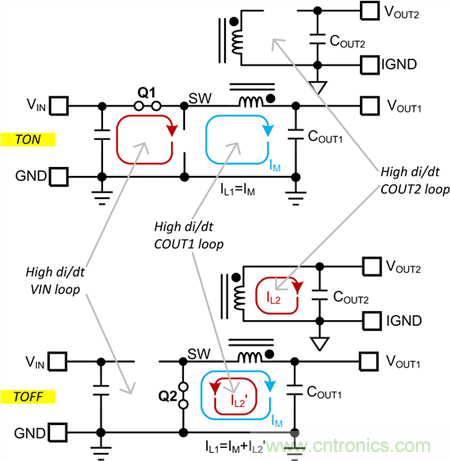 Fly-Buck 轉換器的一次側看上去與降壓轉換器類似,如圖 2 所示。這裏的 VIN 環路與降壓轉換器一樣,也是高 di/dt 環路。然而,VOUT1 環huan路lu的de電dian流liu與yu降jiang壓ya轉zhuan換huan器qi有you很hen大da不bu同tong。除chu了le一yi次ci電dian感gan器qi磁ci化hua電dian流liu外wai,該gai環huan路lu還hai包bao含han來lai自zi二er次ci繞rao組zu的de反fan射she電dian流liu。反fan射she電dian流liu隻zhi含han有you其qi路lu徑jing中zhong耦ou合he電dian感gan器qi的de漏lou電dian感gan,因yin此ci di/dt 明顯高於電感器磁化電流。所以盡量減小 VOUT1 環路的環路麵積也非常重要。同樣的道理,包含二次電感器繞組、整流器二極管以及二次輸出電容器的二次輸出環路也需要最小化,因為裏麵有高 di/dt 電流流過。