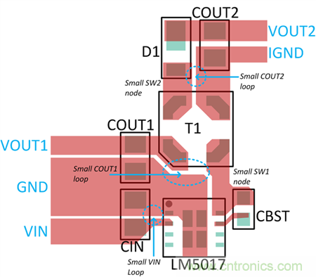 圖 3.基於 LM5017 的 Fly-Buck 布局可對 di/dt 環路和高 di/dt SW1,2 節點麵積進行最小化。