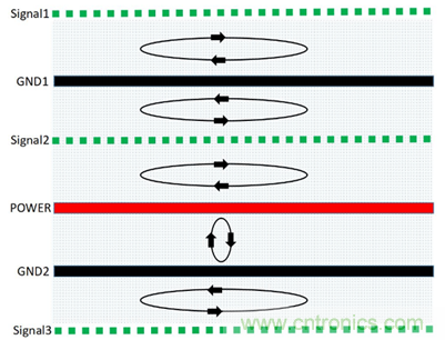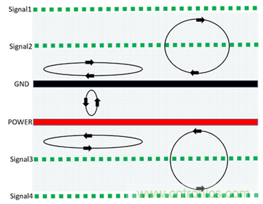 PCB疊層EMC規劃與設計思路的核心就是合理規劃信號回流路徑,盡可能減小信號從單板鏡像層的回流麵積,使得磁通對消或最小化。