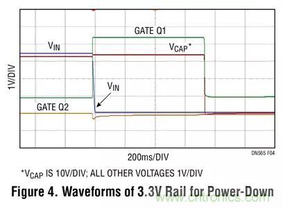 圖 4 示出了失去 3.3V 電壓軌時的波形。當輸入電壓下降時,Q2 的柵極電壓保持不變 (接近於地電位),而且 Q2 處於關斷狀態。與此相反,Q1 的柵極電壓則急劇上升至 3.3V。這把 Q1 關斷,由 Q1 的體二極管起隔離二極管的作用,從而使負載與輸入分離。此時備份電源接管供電,LTC3643 通過釋放存儲電容器的電能以給關鍵的負載提供3.3V。