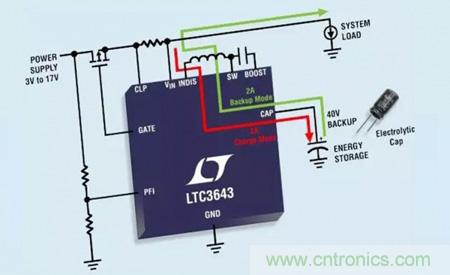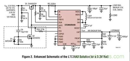 於是,就有了 LTC3643,它能使我們采用一種相對便宜的儲能元件——低成本電解電容器。本文將介紹的是一款電路,它使 LTC3643 用作針對 3.3V 電壓軌的備份電源解決方案。