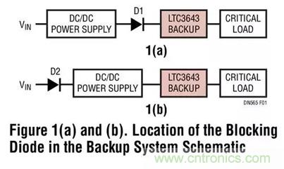 LTC3643 可容易地適用於 5V 和 12V 電壓軌的備份解決方案,但是 3.3V 電壓軌解決方案則需要格外謹慎。LTC3643 的最小工作電壓為 3V,比較接近於 3.3V 的標稱輸入電壓電平。如圖 1a 所示,當采用一個隔離二極管以使備份電壓電源與非關鍵的電路分離時,這種餘量就太嚴緊了。如果 D1 是一個肖特基二極管,其正向壓降 (作為負載電流和溫度之函數) 會達到 0.4V 至 0.5V,足以把 LTC3643 VIN 引腳上的電壓置於 3V 最小值以下。因此,備份電源電路可能無法啟動。