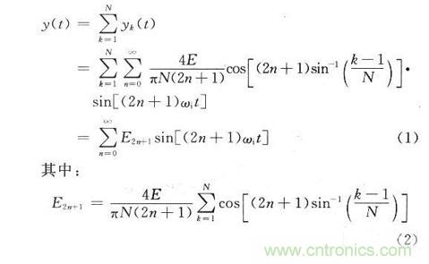 首先對量化過程進行分析,現假設基帶輸入信號為一個正弦信號gi(t)=Esinωit,量化位數為N,經過量化後的信號可用階梯波y(t)表示,y(t)可以被認為是N對矩形波的疊加。如果A/D變換的量化位數為m,那麼正或負半周的量化台階數為N=2m-1。階梯波的表達式為: