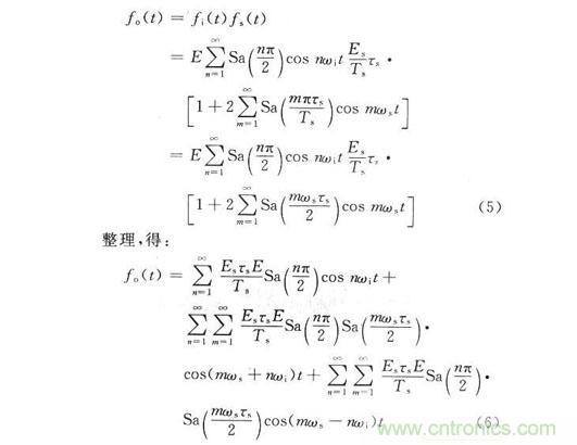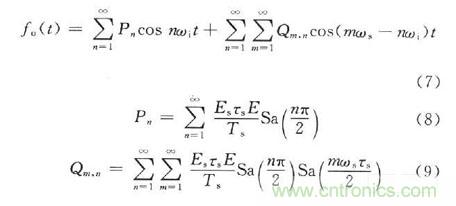 式中:E,ωi分別為輸入信號的幅度和角頻率。設采樣脈衝信號為fs(t),采樣後的信號為fo(t),則采樣過程在時域上的數學表示式為fo(t)=fi(t)fs(t),在DRFM中采用等間隔均勻采樣,采樣周期為Ts,采樣時鍾頻率ωs=2πfs。在實際電路中,采樣是在采樣脈衝上升的瞬間完成的。因此采樣脈衝的寬度可以看成一個窄脈寬,用τs。來表示。采樣脈衝的傅裏葉級數為: