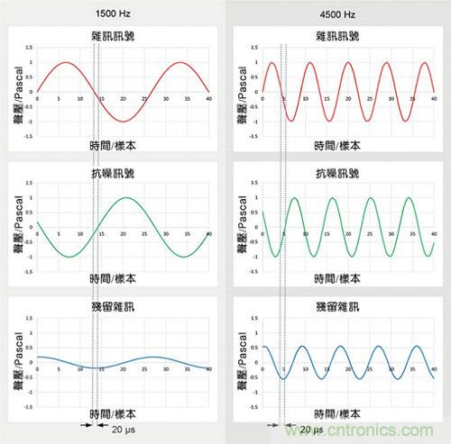 前饋降噪帶寬,在低頻處被耳機驅動模塊限製在50Hz左右,在高頻處被聲學結構和訊號處理延遲限製於3kHz。延遲會導致難以在抗噪訊號和噪聲訊號之間實現180度的相位反轉,高頻部份因為波長較短更難處理。圖2顯示了兩種頻率下20μs延遲對降噪效果的影響:頻率為1500Hz時,殘餘噪聲約剩1/5(14dB ANC),但頻率為4500Hz時,即使延遲不變,殘餘噪聲也已增加到3/5(僅4dB ANC)。