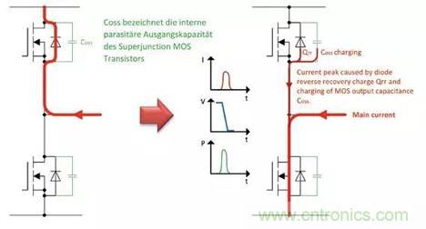 在導通期間,該電壓依賴性導致損耗誘導的充電電流的主要部分流過Q1的低VDS。然而,Q1兩端的低電壓意味著半橋導通的低端晶體管有著高電壓導通。由於充電電流峰值,導致晶體管的導通損耗很高。