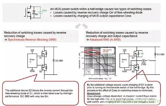 同步反向阻斷(SRB)串聯第二開關晶體管Q2以阻斷開關晶體管Q1的續流二極管中的反向電流。Q2的激活與Q1同步。反向電流通過並聯的碳化矽(SiC)肖特基二極管,該二極管具有高擊穿電壓和極低的反向恢複電荷,這大大降低了Qrr對開關損耗的影響。Q2的續流二極管的極性確保晶體管不能產生高電壓,因此,低介電強度(60 V)的型款就足夠了。