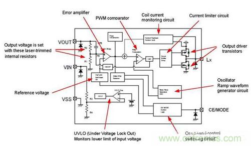 內部電路由基準電壓、誤差放大器、振蕩器、指示燈波形、PWM比較器、UVLO、限定電流電路等構成,固定輸出電壓型由激光微調固定調整了內部電阻R1/R2的電阻比。工作電壓範圍在1.8V~6V之間。此外,內部調整了放大器的相位補償及送信頻率、軟啟動時間等,可以完全無須調整地使用。