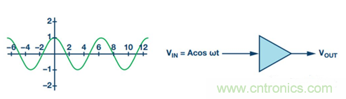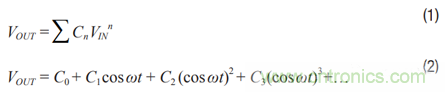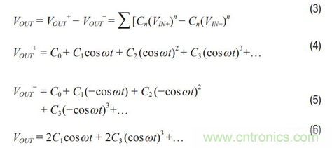 差分信號可抑製偶數階諧波。以下展示了連續波(CW)通過一個 增益模塊的示例。當使用一個單端放大器時,如圖2所示,輸出 可表示為公式1和公式2。