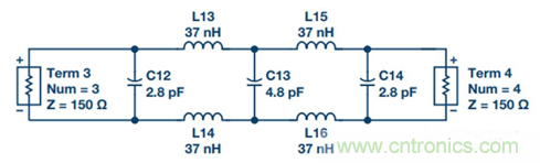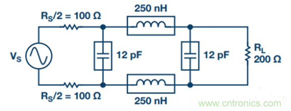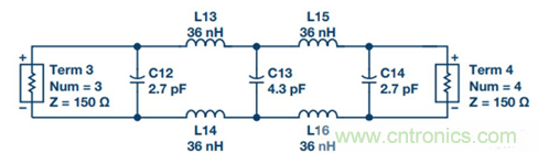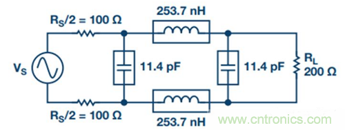 2. 將單端濾波器變為差分濾波器。源阻抗和負載阻抗保持不變,所有電容並聯,所有串聯電感減半並放在另一差分路徑中(參見圖17)。