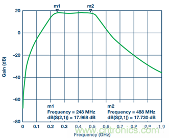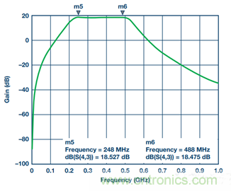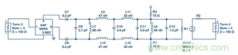 4. 對於子係統級仿真,應在輸入端增加ADL5201 DGA S參數文件,並使用壓控電壓源來模擬濾波器輸出端的 AD6641 ADC。為將低通濾波器變為帶通濾波器,增加兩個分流電感:L7與C9並聯,L8與C11並聯。C12代表AD6641輸入電容。R3和R4是放在AD6641輸入端的兩個負載電阻,用作濾波器的負載。AD6641輸入為高阻抗。調諧後的情況參見圖19。