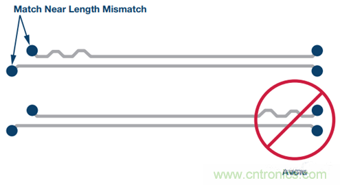 成對差分走線的長度須相同。此規則源自這一事實:差分接收器檢測正負信號跨過彼此的點,即交越點。因此,信號須同時到達接收器才能正常工作。