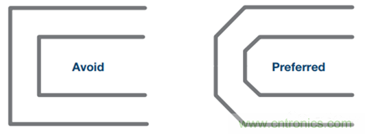 差分對布線時,應避免急轉彎(90°)(參見圖23)。