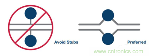 差分對布線時,應使用對稱布線(參見圖24)。若需要測試點, 應避免引入走線分支,而且測試點應對稱放置(參見圖25)。