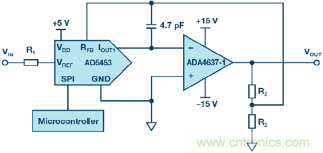 圖1顯示了一個帶下遊放大器的14位MDAC AD5453 ,放大器可根據DAC的編程數字碼放大或削弱信號。