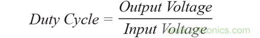 如果將一個降壓轉換器(降壓器)用於此單一轉換步驟,如圖1所示,會出現小占空比的問題。占空比反映導通時間(當主開關導通時)和斷開時間(當主開關斷開時)之間的關係。降壓轉換器的占空比由以下公式定義: