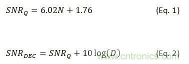 例如,要使抽取因子為2,必須讓信號的過采樣因子至少為2。在這個例子中,信號功率保持不變,但奈奎斯特帶寬被減半。這就消除了一半的噪聲功率,從而讓該ADC的SNR增加了3dB。第一個方程式表示因量化噪聲得到的理想SNR,其中N是該轉換器的位數。第二個方程式則表示與抽取因子D相關的SNR改善值。