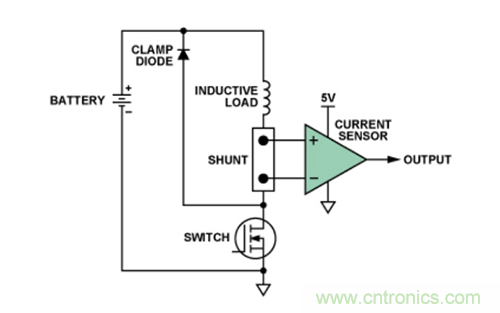 本例將詳細介紹一種典型的高端電流檢測應用。圖1所示為汽車應用環境中用於監控電磁閥或其它感性負載的常見配置。