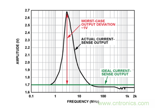 圖2所示為輸入在較寬頻率範圍內變化時電流傳感器的直流輸出與其理想值的偏差情況。從圖中可以看出,在1 MHz至20 MHz的頻率範圍內,偏差最為顯著(>0.1 V),且3 MHz時直流誤差達到最大值(1 V),這在放大器0 V至5 V的輸出電壓範圍中占據很大比例。