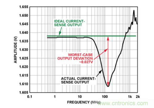 這種情況下,40 MHz時誤差僅為3 mV左右,且峰值誤差(大於100 MHz時)小於30 mV,性能提高35倍。這點清楚地表明,內置EMI濾波電路有助於顯著提高電流傳感器防護性能,使其免受輸入端存在的高頻信號影響。在實際應用中,盡管並不清楚EMI的嚴重程度,但是如果使用內置EMI濾波功能的電流傳感器,實際上控製環路將會保持在其容差範圍內。